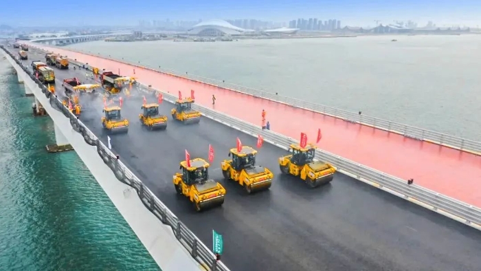 翔安大橋在建設(shè)中既要克服海上風(fēng)浪大、潮差高、巖層強(qiáng)度高、跨越生態(tài)保護(hù)區(qū)等困難,又要兼顧綠色環(huán)保;要在這種復(fù)雜的環(huán)境中保證施工質(zhì)量,對設(shè)備和施工技術(shù)的選擇就顯得尤為重要。徐工數(shù)字化智能施工集群憑借其智能化、高精度、高效率等顯著優(yōu)勢,成功克服了傳統(tǒng)施工方式難以應(yīng)對的諸多難題,可精準(zhǔn)適配翔安大橋的橋面鋪裝工作。