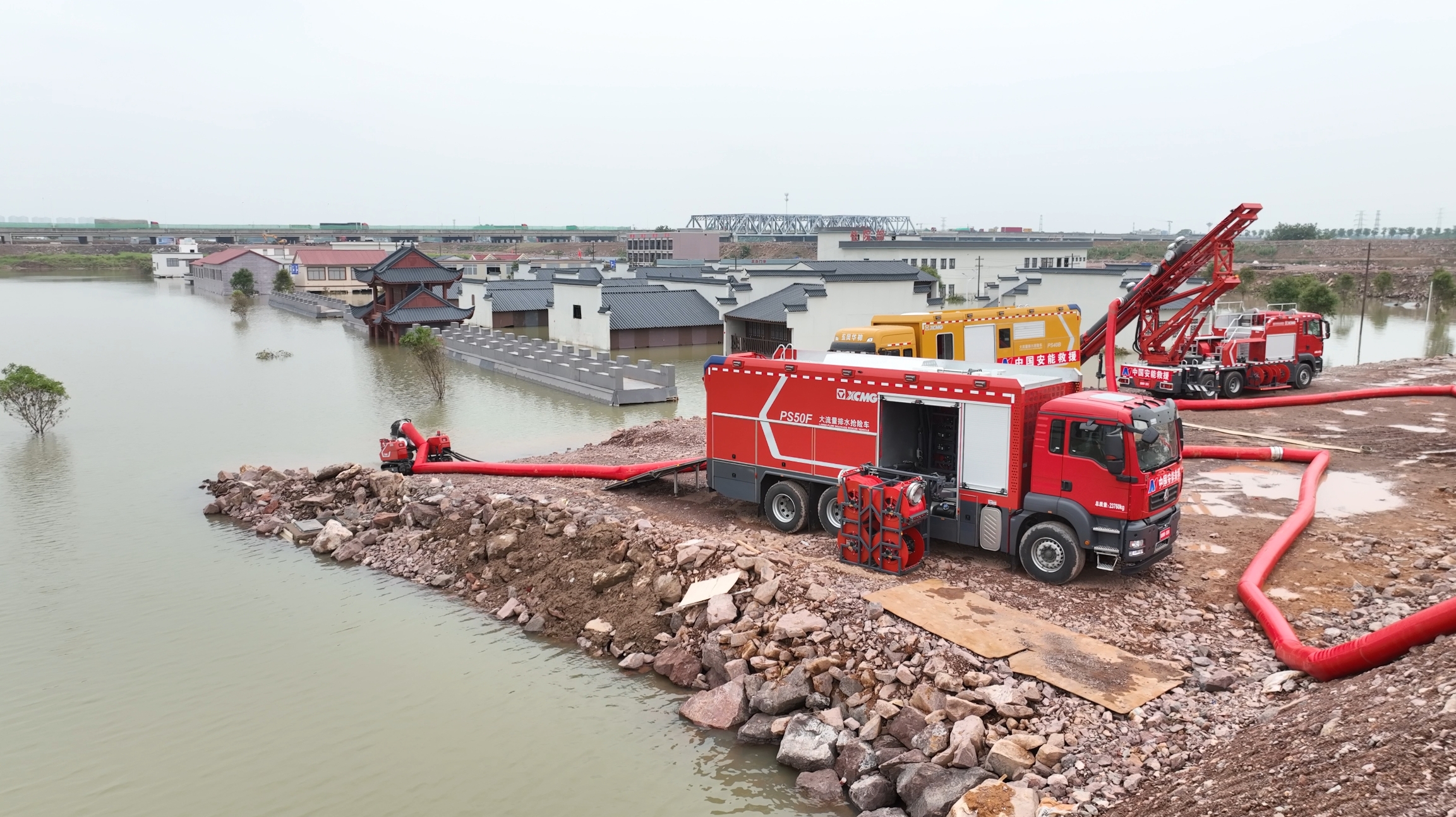 在各類洪澇災害搶險救援中“身經百戰(zhàn)”的徐工PS50F子母式排水搶險車、GP35C垂直排水搶險車、PS40B泵組式排水搶險車聯(lián)合應戰(zhàn),充分參與排水搶險項目演練。
