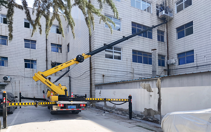 在現(xiàn)場可以看到,GKS28D結(jié)構(gòu)緊湊,整車尺寸小,能在小區(qū)狹窄道路內(nèi)穿梭自如;作業(yè)斗將鋼架物料和一名施工人員平穩(wěn)快速運送至起始作業(yè)點位,從右至左依次安裝鋼架,設(shè)備作業(yè)幅度覆蓋整排樓體外立面,可輕松到達(dá)指定位置;同時,無線遙控器能夠幫助檢修人員“無死角”觀察到作業(yè)平臺位置,大大提高了移動效率和精準(zhǔn)度。