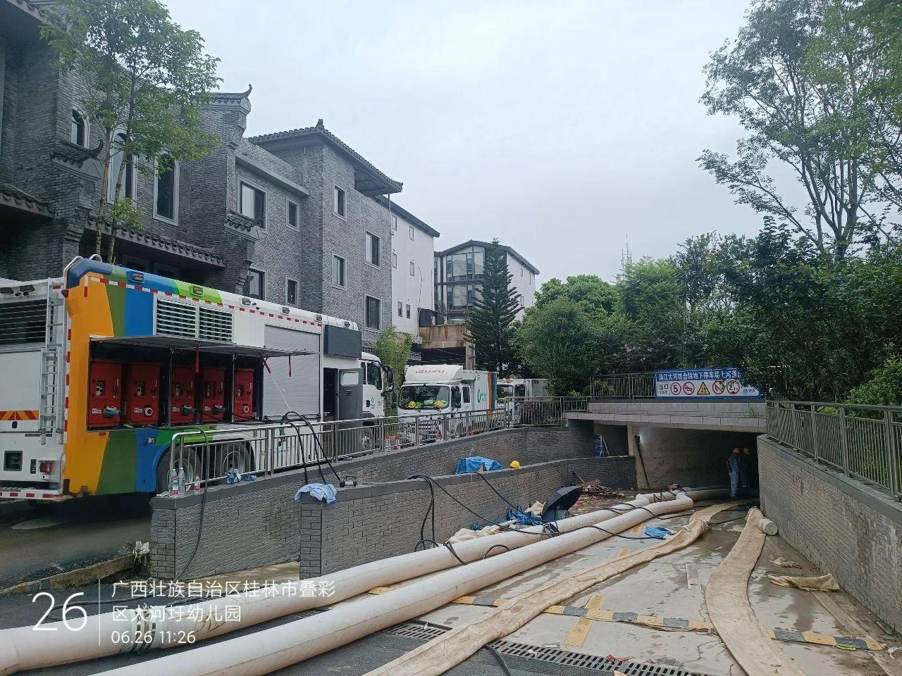 除桂林站地下停車場之外,徐工排澇產(chǎn)品還參與了桂林丹桂府小區(qū)以及大河圩旁的地下車庫內(nèi)澇救援任務(wù)。