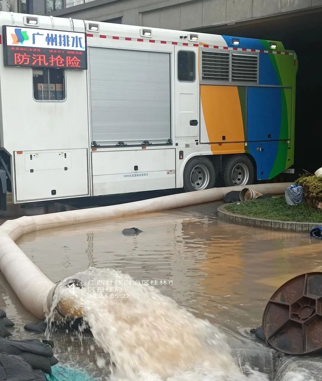 在位于桂林疊彩區(qū)大河圩旁的地下車庫,徐工PS50B泵組式大流量排水搶險車“五泵齊發(fā)”,再顯排水威力,經(jīng)過半日1夜的奮戰(zhàn),將洪水抽排見底。除設(shè)備外,徐工服務(wù)工程師也是24小時待命,全面進(jìn)行現(xiàn)場保障,為助力桂林開啟加速“修復(fù)”模式,貢獻(xiàn)徐工力量。