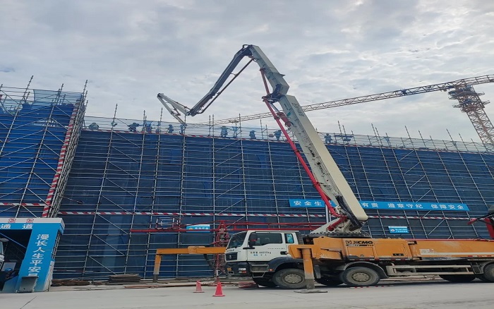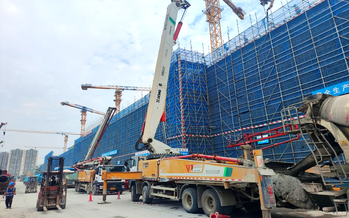 施工現(xiàn)場,臂架林立、機器運轉(zhuǎn),徐工成套混凝土機械聯(lián)袂出擊,新能源攪拌車、車載泵、泵車齊上陣,從混凝土運輸、泵送施工、服務保障等方面守護項目順利進行。