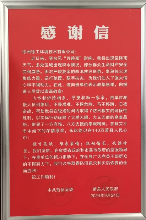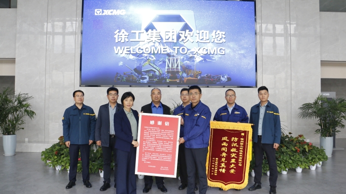 “此行是專門來感謝徐工在蕭縣防汛救災中的無私奉獻?!?/strong>董局長表示,“你們的行動不僅體現(xiàn)了徐工的社會責任感,更讓我們感受到了‘防汛救災顯大愛 風雨同舟見真情’的深刻內(nèi)涵。我們特地做了錦旗和感謝信,來表達我們的謝意?!?/span>