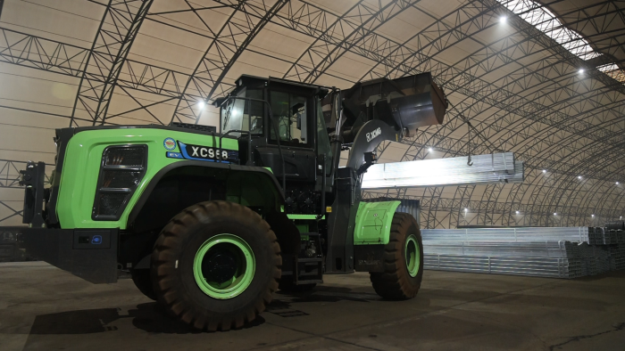 貨運站臺上,一臺綠甲戰(zhàn)士格外引人注目,這臺徐工XC968-EV純電動裝載機不同以往的圓弧型大臂像極了武俠小說中的“圓月彎刀”,格外引人注目。