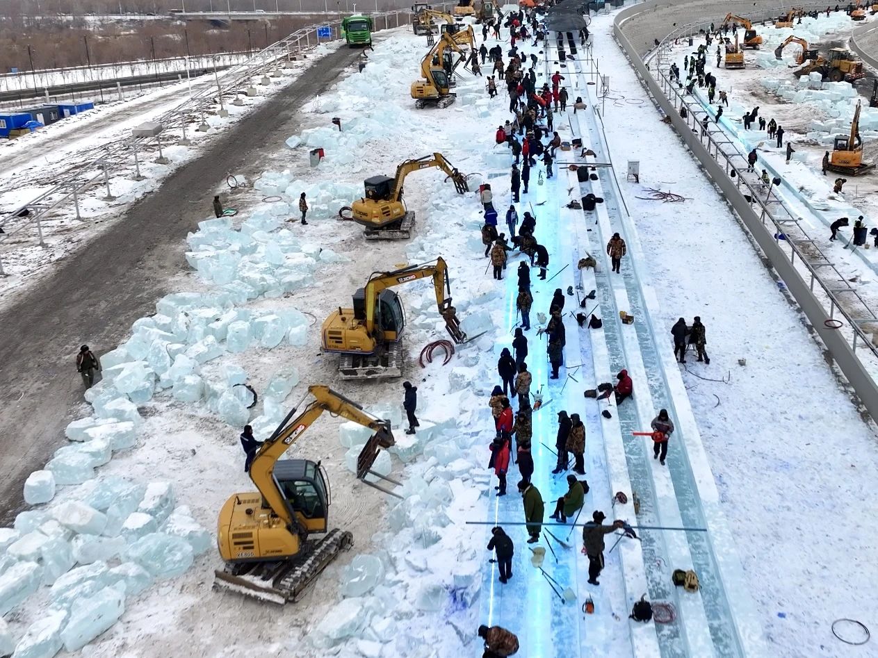 全長(zhǎng)500米的“冰雪大滑梯”無(wú)疑是園區(qū)內(nèi)的“人氣王”,今年迎來(lái)了重磅升級(jí),滑梯滑道增加至24條,徐工挖掘機(jī)在滑梯建設(shè)中起到了關(guān)鍵作用。
