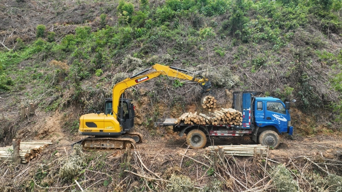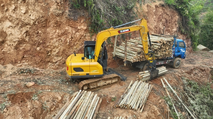 在鄭俊負(fù)責(zé)的林場(chǎng),每節(jié)木材長(zhǎng)度2.6米,徐工XE85GF一次可以?shī)A10節(jié)以上的木材,重量超過1噸,而之前的輪挖夾裝0.6噸木材已是極限。