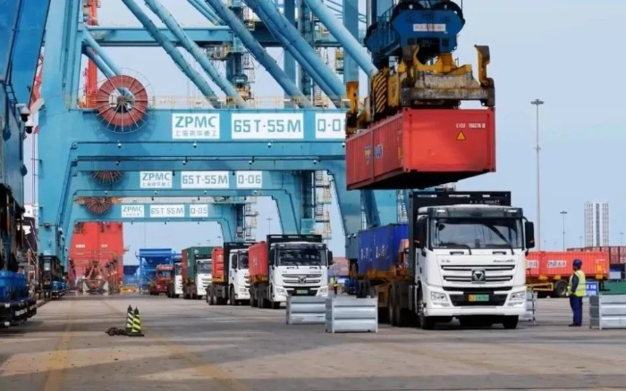 巨輪泊岸,裝船機臂展如虹,一輛輛身披晨光的徐工新能源重卡,在碼頭前沿與堆場間穿梭不息,織就一幅物流奔騰、經(jīng)濟躍動的壯闊圖景。