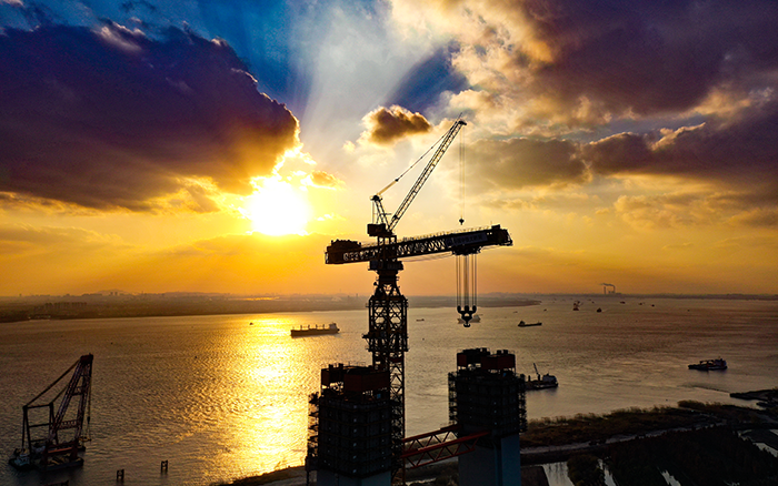 近日,在世界最大跨徑懸索橋--張靖皋長江大橋南航道橋北主塔施工現(xiàn)場,徐工XGT15000-600S超大型塔機如鋼鐵巨人伸展手臂,將重達數(shù)百噸的鋼塔節(jié)段緩緩吊起,“搭積木”般穩(wěn)穩(wěn)放落在塔柱上,贏得施工方“技術(shù)先進、安全可靠、吊裝能力強、操作平穩(wěn)、就位精準(zhǔn)、安拆效率高、智能化水平高、施工效益顯著”的高度肯定。