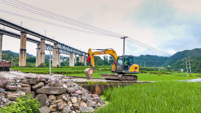 雨季施工,場地濕滑狹窄,對設(shè)備靈活性、可靠性和機(jī)手技術(shù)都是嚴(yán)峻的考驗(yàn)。在這片泥濘的稻田邊、陡峭的坡地上,身披“徐工金”的XE75GA挖掘機(jī),正化身開路先鋒,為苗鄉(xiāng)新居夯下第一塊基石。