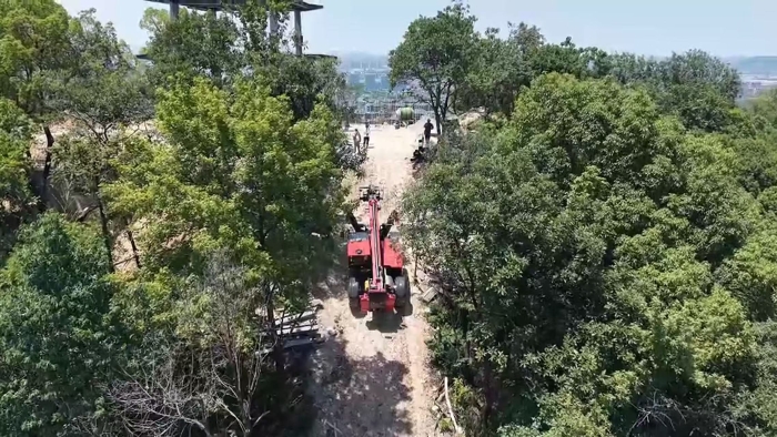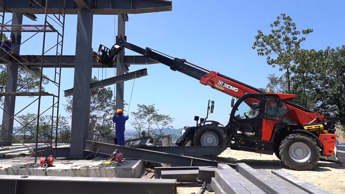 穿過羅峰寺旁的盤山公路,一抹紅色在山野間格外顯眼,徐工伸縮臂叉裝車XT4018K正將重達2.2噸的結(jié)構(gòu)物料運送至14米的高度,全力建設(shè)全鋼結(jié)構(gòu)寺廟。