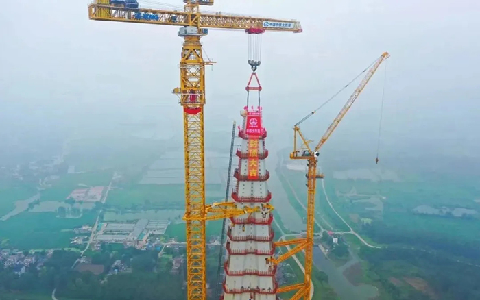 本次封頂?shù)?號(hào)墩主塔為大橋中塔柱,塔高345.6米,是全橋最高主塔,采用分塊大節(jié)段整體吊裝,共分39個(gè)吊裝節(jié)段,單節(jié)鋼塔最大重量為482.7噸。
