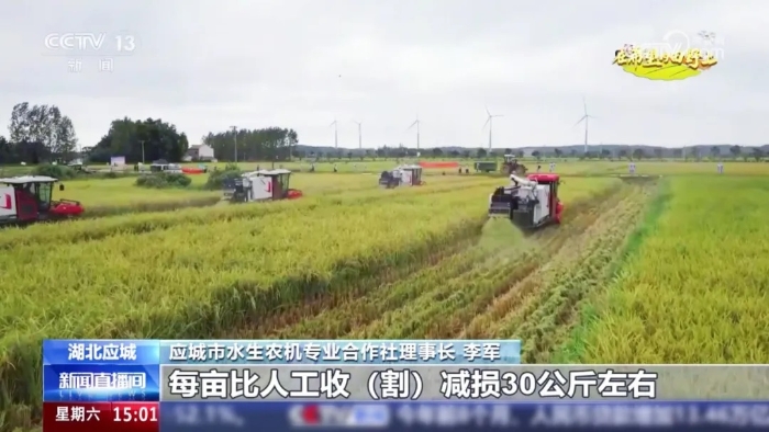 9月20日,中央電視臺新聞頻道《新聞直播間》“在希望的田野上”欄目將鏡頭對準湖北應城,報道了八臺徐工XR720履帶式谷物聯(lián)合收獲機在當?shù)亻_展大規(guī)模糯稻收割的豐收盛景——履帶滾滾,金黃的稻穗迅速被吞入機器,頃刻間完成收割、脫粒、清選等一系列作業(yè),顆顆飽滿的籽粒穩(wěn)穩(wěn)落入糧倉。