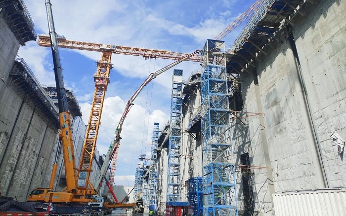 閘門立柱高聳入云,澆筑精度要求堪比“云端繡花”。徐工泵車、起重、塔機(jī)成套化裝備舉重若輕,天塹之間“穿針引線”!