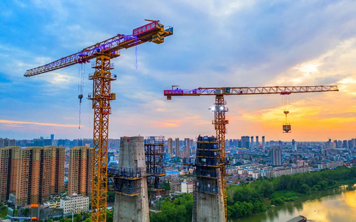 近日,數(shù)臺徐工XGT7527A-18S塔機聳立潁河之畔,百米身姿、直插云端,晚霞映襯下的“徐工金”更加耀眼。