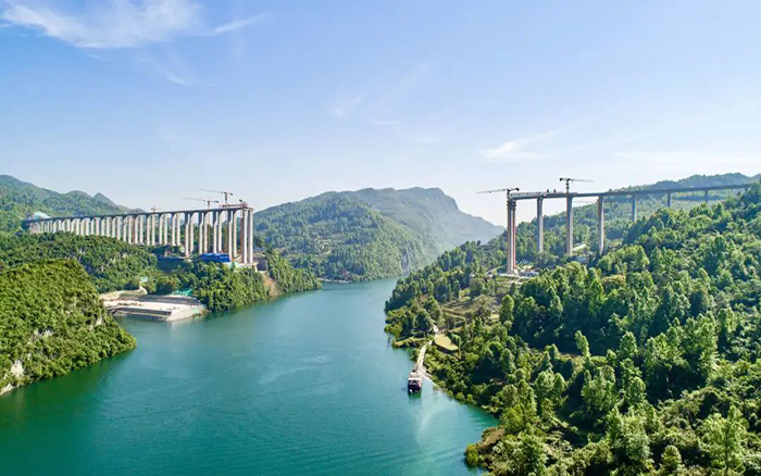 烏江特大橋全長1834米,主橋為504米上承式鋼管混凝土拱橋,是德余高速公路的重要控制性工程,也是世界最大跨徑上承式鋼管混凝土拱橋。大橋采用的拱、柱、梁全固結(jié)無支座整體式受力體系為國內(nèi)首創(chuàng),施工極具難度,代表了目前同類型橋梁建造的世界頂級水平。