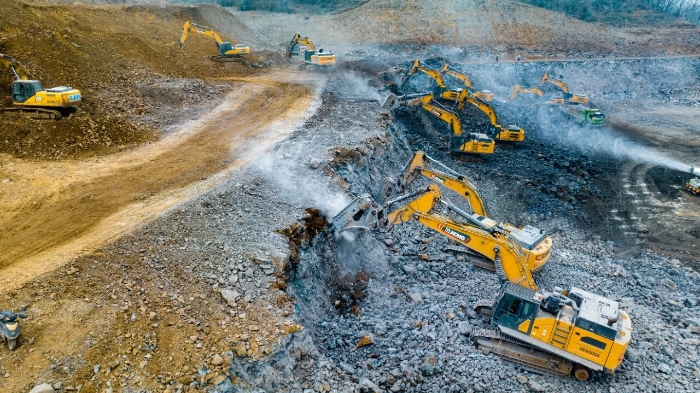 為確保工程節(jié)點,施工方經(jīng)多輪方案論證,最終引入了14臺徐工挖掘機(jī)組成的主力設(shè)備集群,承擔(dān)核心的山體破碎及土石料裝車任務(wù)。在總量高達(dá)300萬方的工程面前,徐工XE650GK、XE380K、XE335GK等機(jī)型展現(xiàn)出強(qiáng)大的工況適應(yīng)性。其中,8臺明星機(jī)型XE650GK配備215型破碎錘,憑借其獨(dú)有的破碎多級調(diào)頻控制技術(shù),在面對高硬度玄武巖時日均破碎量穩(wěn)定在1500噸以上,同時將油耗控制在約40升/小時,實現(xiàn)了效率與節(jié)能的出色平衡。