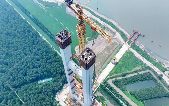 在靖江市馬洲島上空,重達(dá)238噸的T29鋼塔節(jié)段在徐工XGT15000-600S超級(jí)塔機(jī)的穩(wěn)定牽引下平穩(wěn)攀升,精準(zhǔn)完成高空對(duì)接,整個(gè)吊裝過(guò)程中,塔身始終穩(wěn)如磐石,為張靖皋長(zhǎng)江大橋關(guān)鍵節(jié)點(diǎn)的突破提供了堅(jiān)實(shí)支撐。