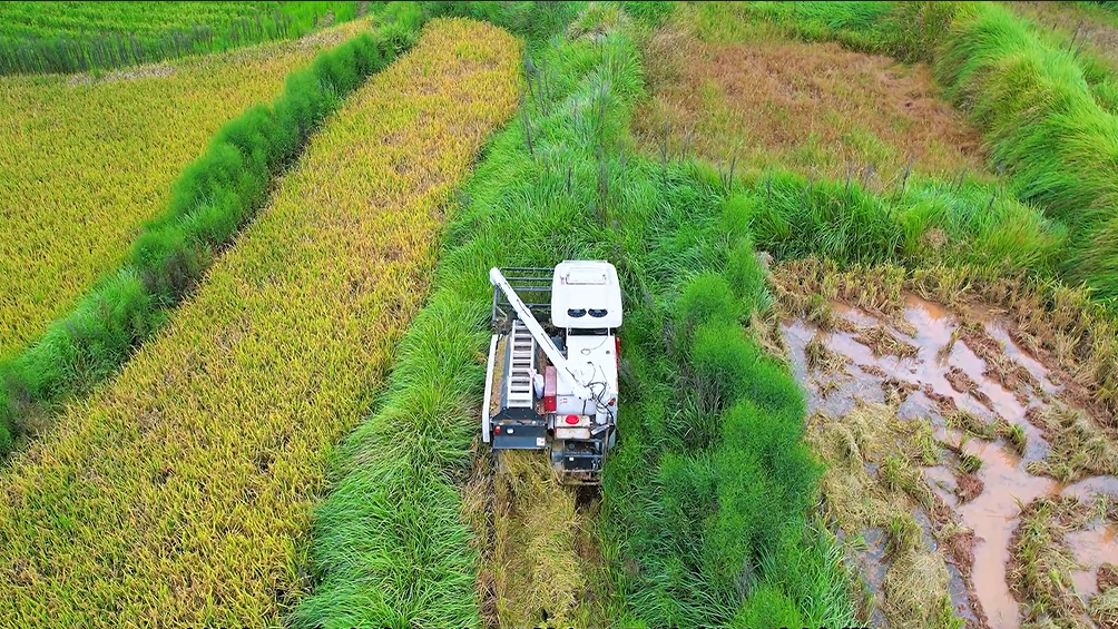 這車特別適合我們丘陵地區(qū),爬坡上坎完全不在話下,因為這臺機器重心設計合理,離地間隙也高,防陷能力強,爛泥田通過性也很好。割臺設計得短,下坡也不容易吃土,用著很踏實。