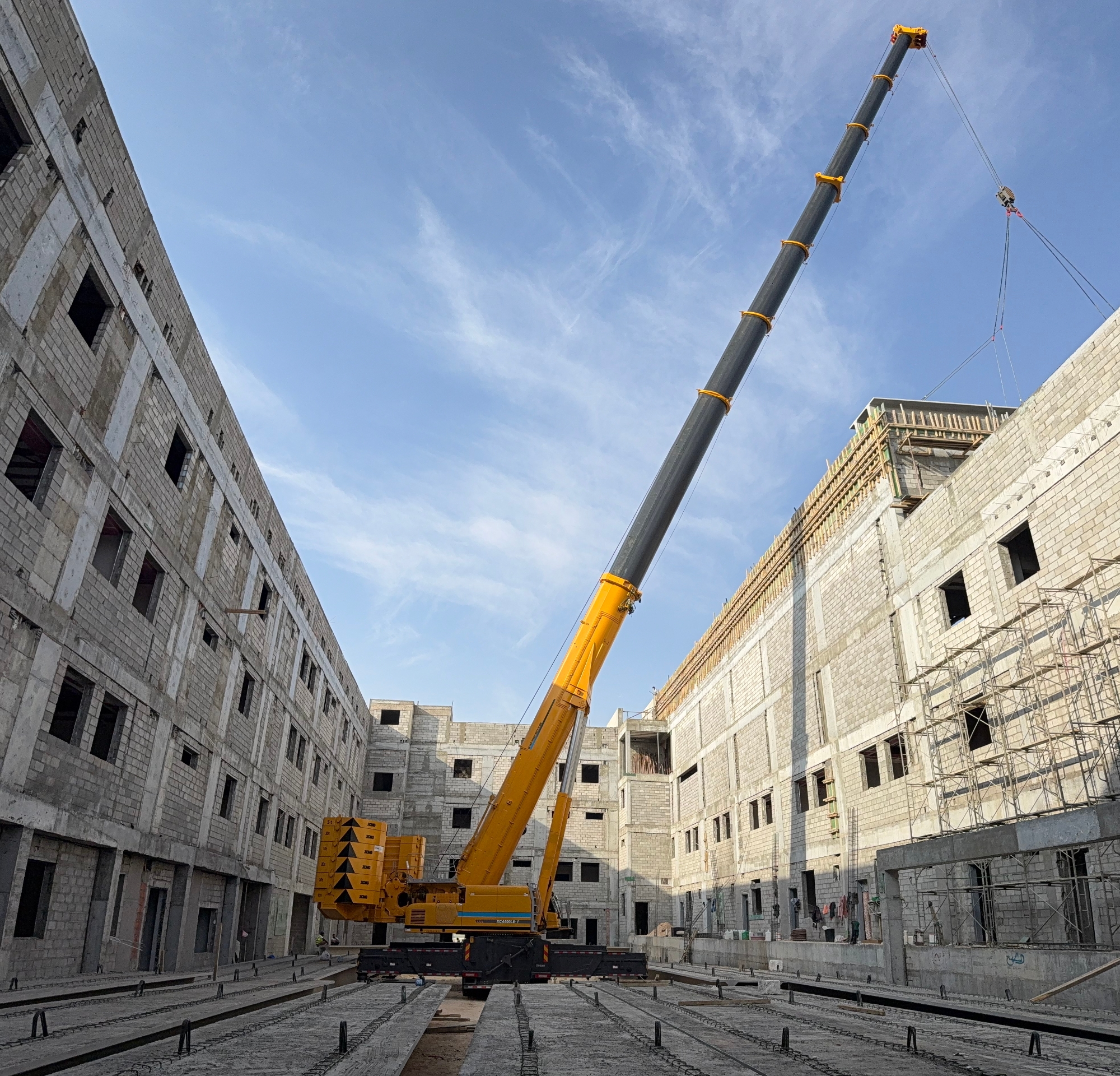此次施工位于沙特快速發(fā)展的都市區(qū)域,項目本身對工期與精度有著嚴苛要求。高層建筑的樓板吊裝,尤其是對于重量超過十噸的大型預制構(gòu)件,不僅是對起重機極限載荷能力的考驗,更涉及在復雜城市空間中的微動操作、抗風穩(wěn)定及高空精準就位等一系列高技術(shù)要求?,F(xiàn)場空間有限,周邊環(huán)境復雜,對設備的機動性、站位適應性以及操控的精細度提出了全方位挑戰(zhàn)。