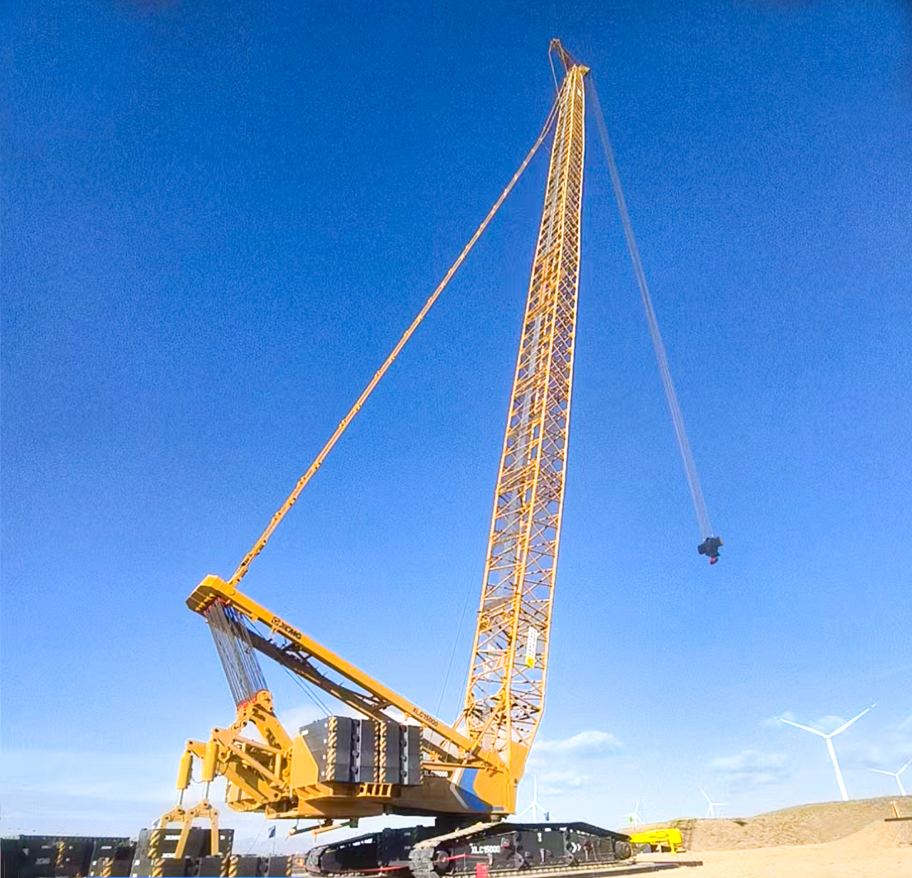 XLC15000采用超起工況,將130噸機(jī)艙穩(wěn)穩(wěn)送至百米高空,吊鉤動(dòng)態(tài)防擺技術(shù)悄然發(fā)力,重物如被無形的手托穩(wěn),毫米級(jí)精準(zhǔn)對(duì)接塔筒法蘭,風(fēng)沙難擾分毫。